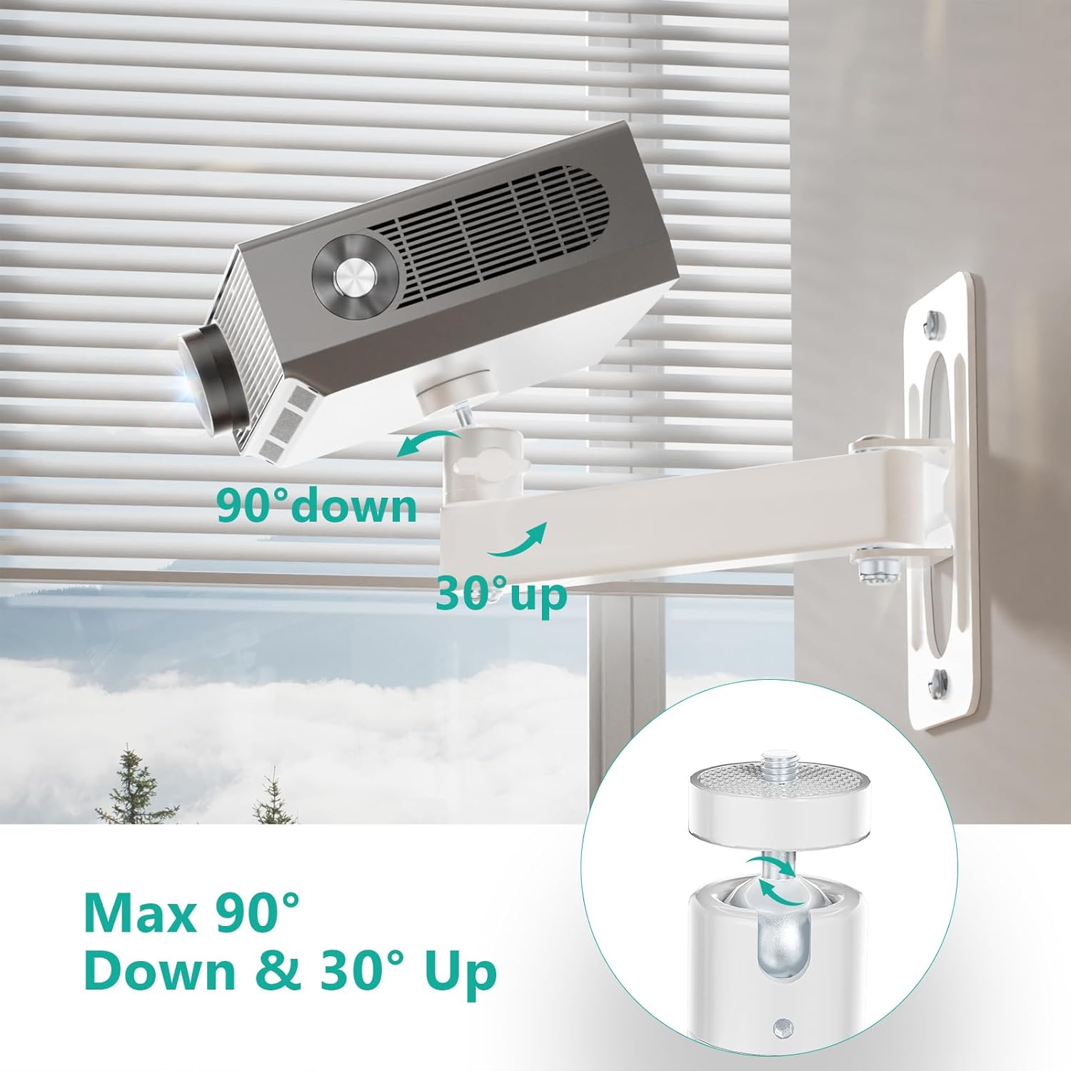 1.Projector wall mount fits any projector with 1/4"、M4、M6 thread and up to 4.4lbs weight.2. Arm swivels at +180°/-180°. Monitor head tilts max 90° dowm and...