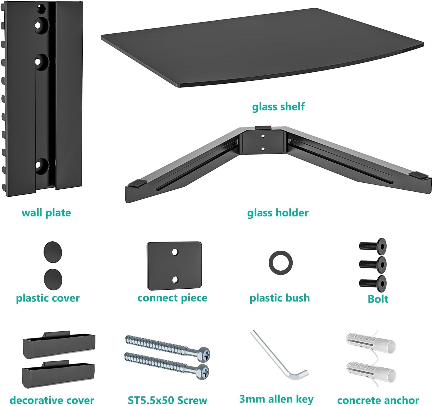 Package Includes: 1 x WALI Floating Shelf System (Black), 1 x Strengthened Tempered Glass, Mounting Hardware Kit, User Manual, experienced and friendly US based customer support available to assist 7 days a week.