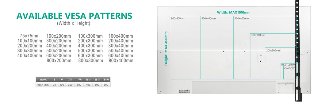 The VESA Standard defines the distance in millimeters between the four mounting holes on the back of a TV or Monitor (distance horizontally x distance vertically).