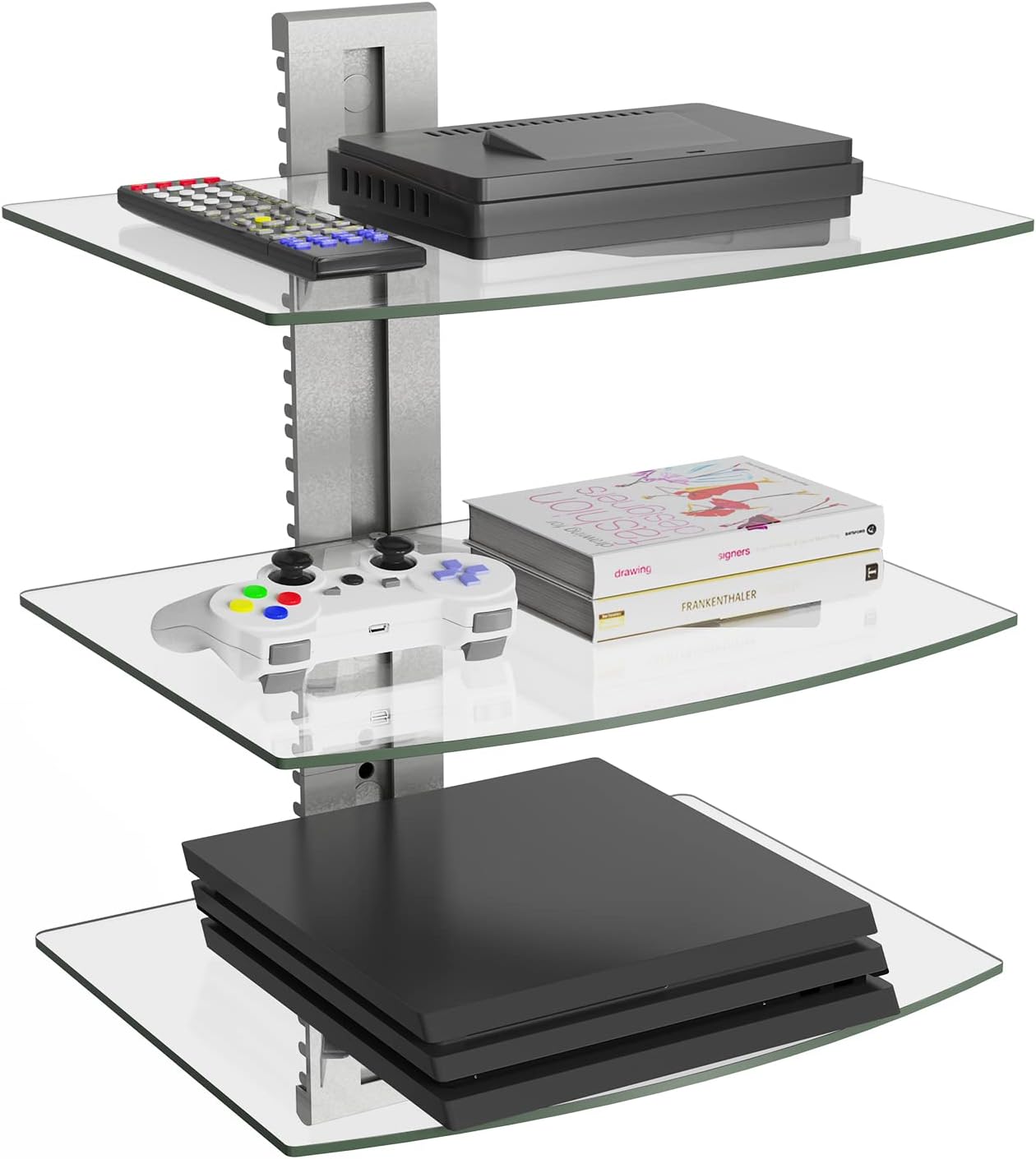 WALI Floating Entertainment Center Shelves, Holds Up to 17.6lbs, TV Shelf with Strengthened Tempered Glasses for DVD Players, Cable Boxes, Games Consoles, TV Accessories (CS303S), 3 Shelf, Silver