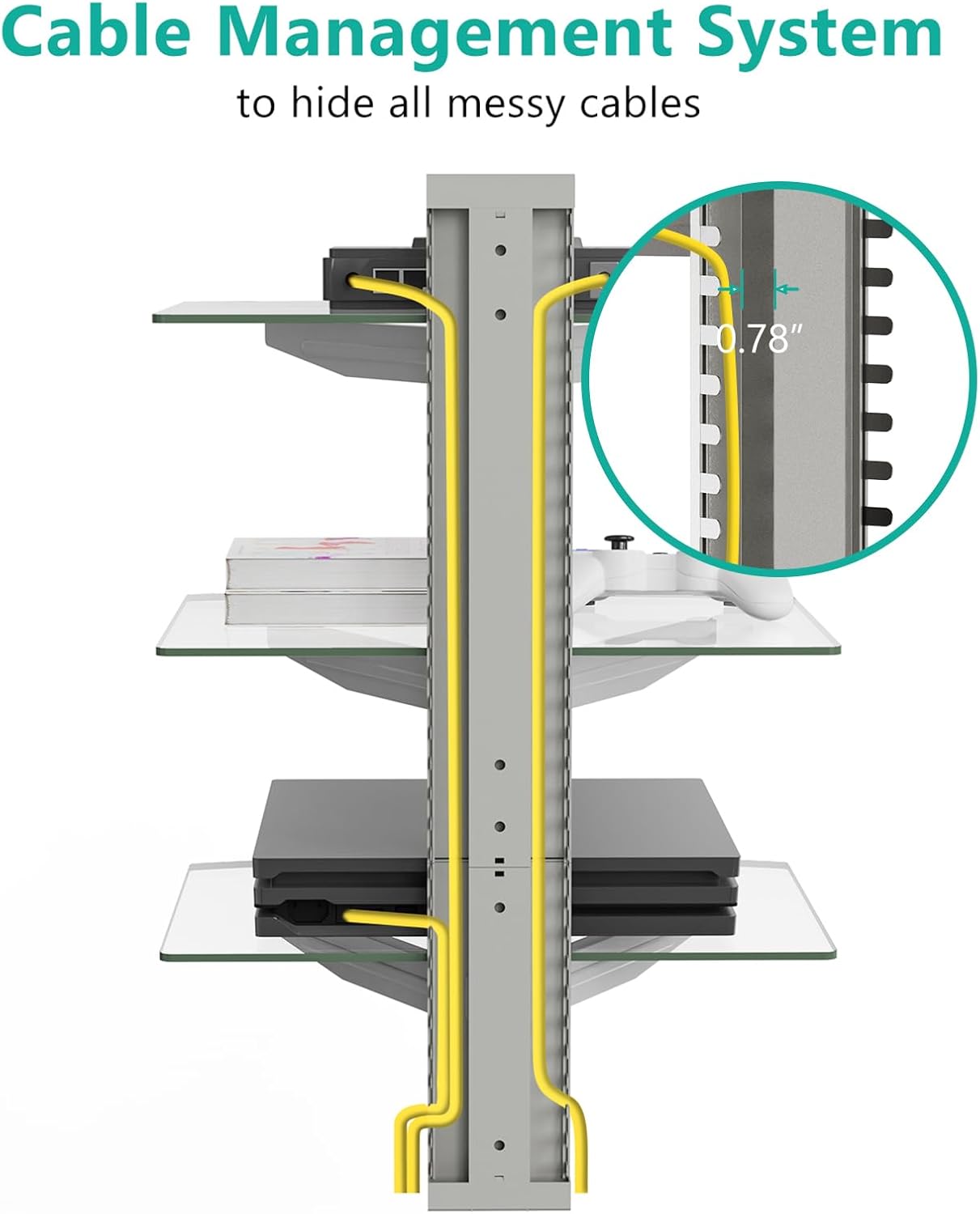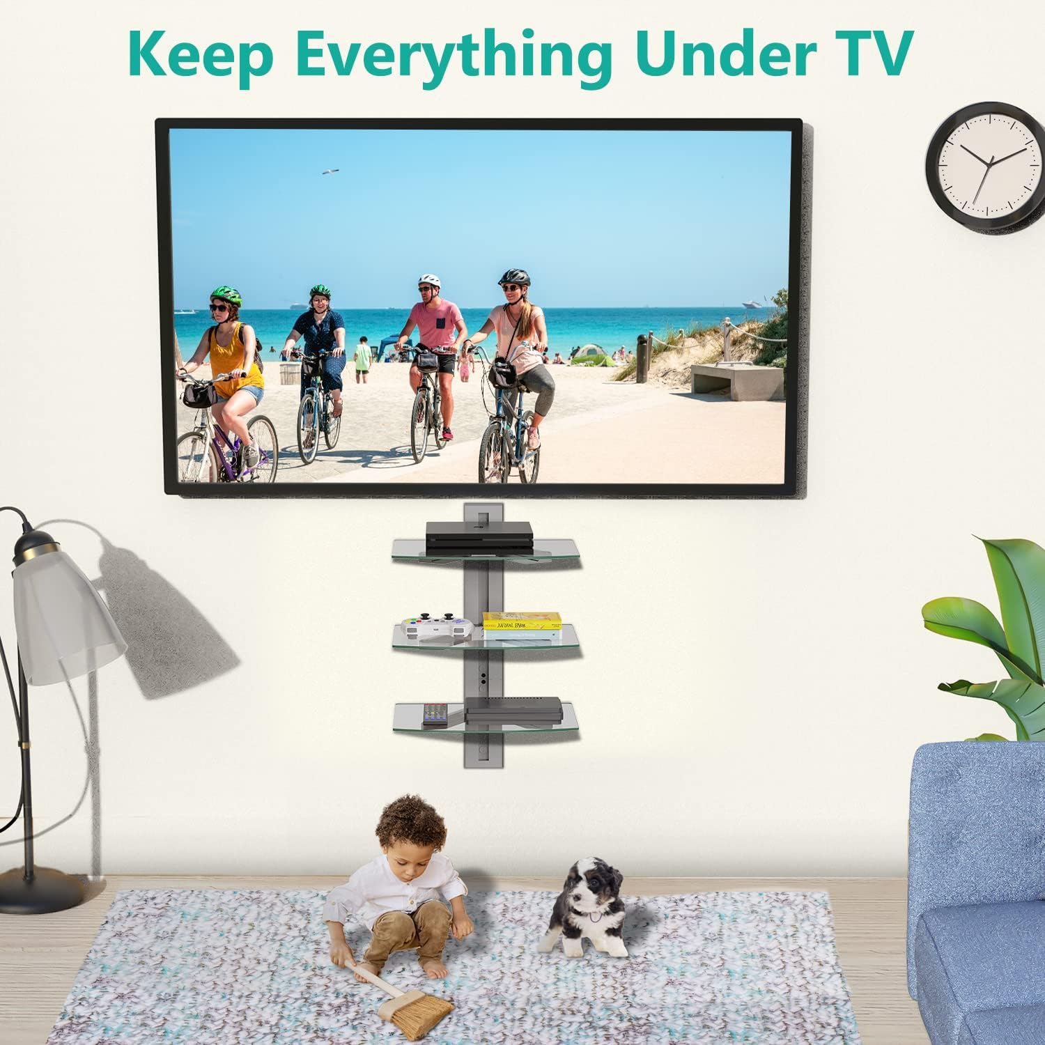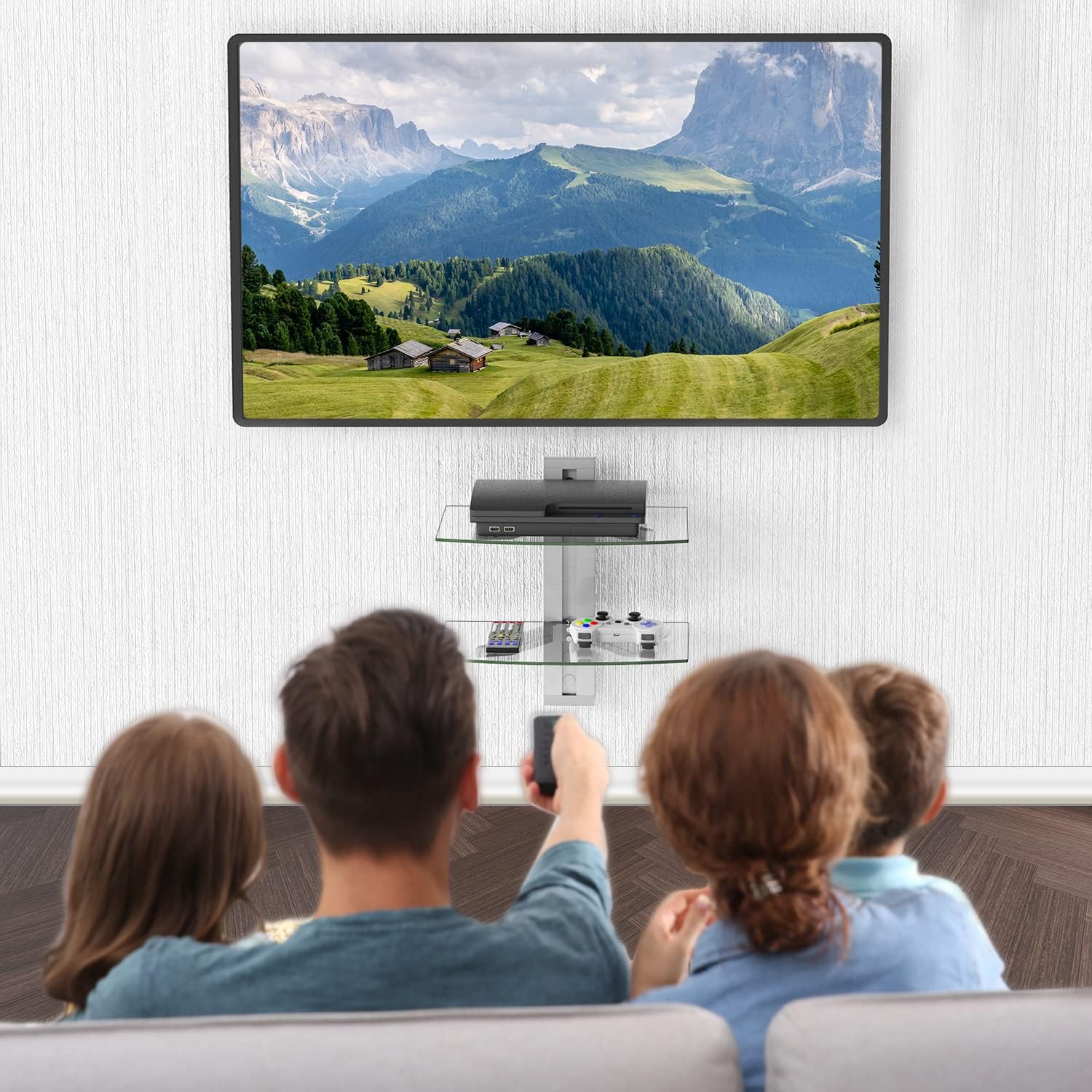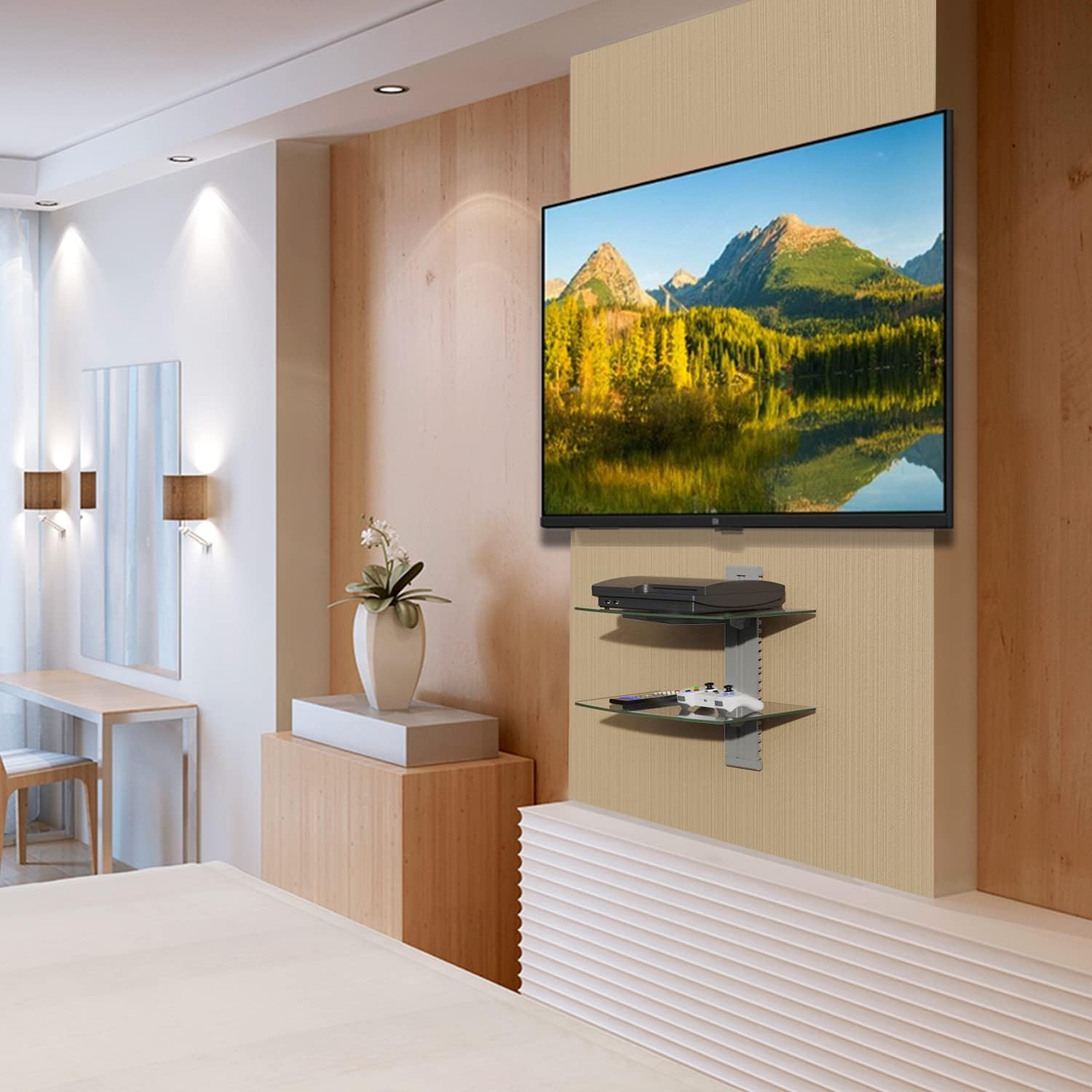 Smart Design: Elegant floating shelf (with adjustable height) to free up floor space and enhance the look of your entertainment system