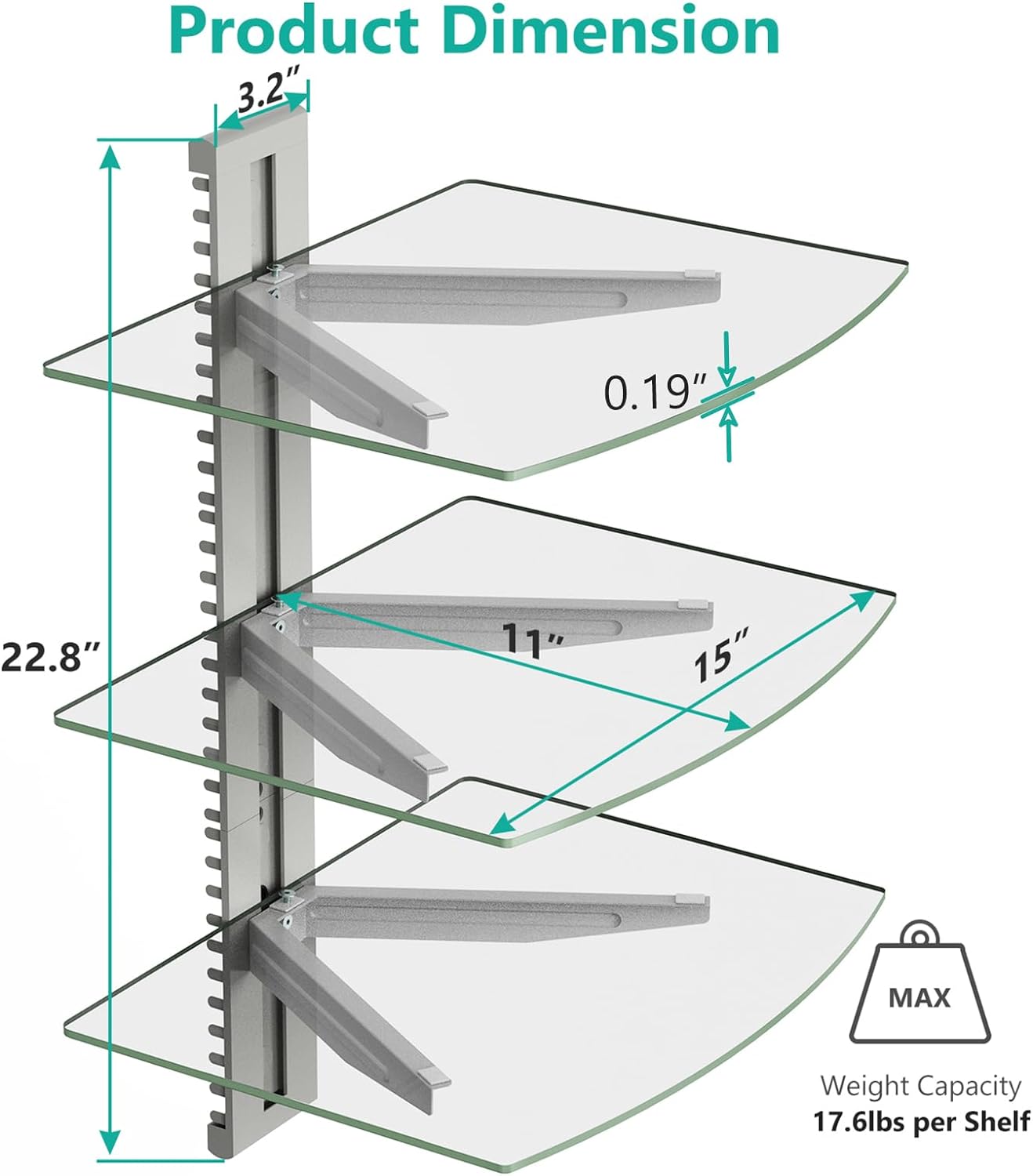 Features: This updated 3 Shelves system that can be detached and reconstructed into a 1 shelf unit and 2 shelves unit. Large Strengthened Tempered Glass Shelf (Each glass measures 15 inch x 11 inch),supporting a maximum weight up to 8kg (17.6lbs) per shelf