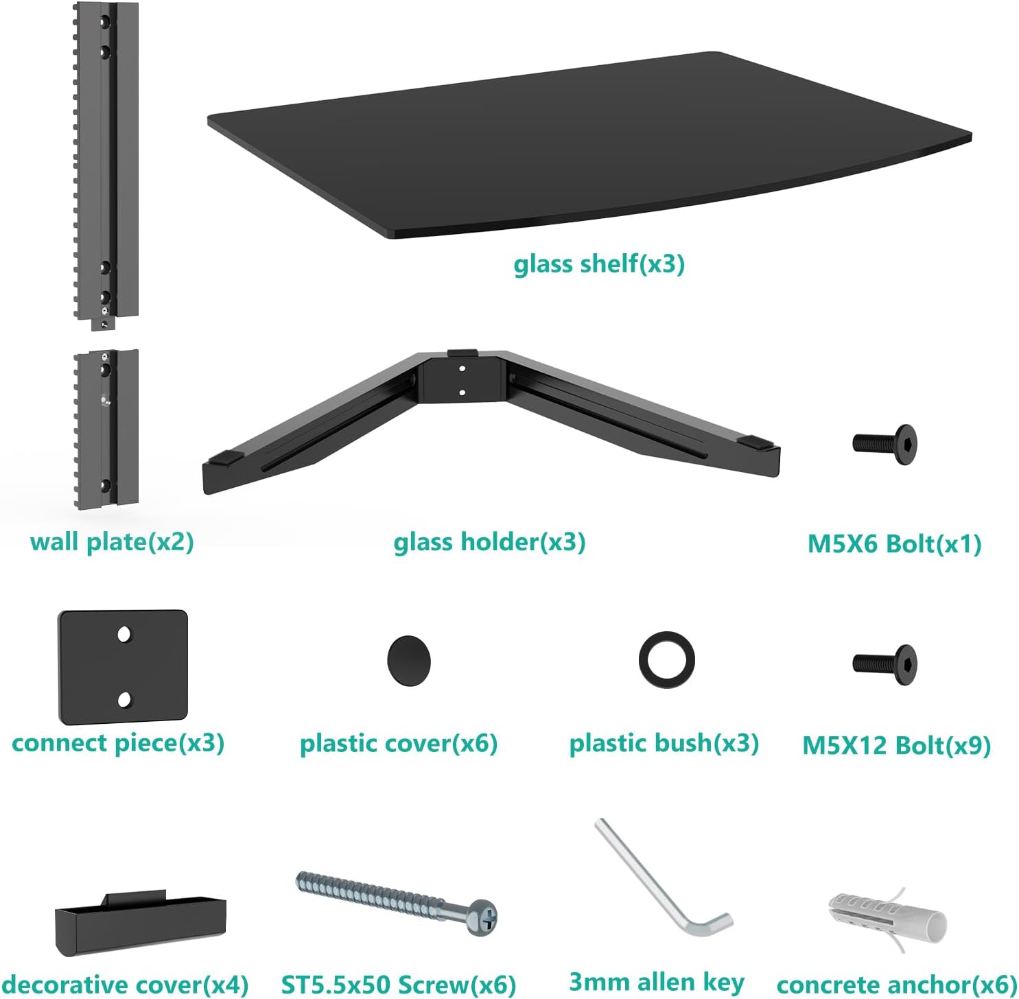 WALI Floating Entertainment Center Shelves, Holds Up to 17.6lbs, TV Shelf with Strengthened Tempered Glasses for DVD Players, Cable Boxes, Games Consoles, TV Accessories (CS303B), 3 Shelf, Black